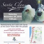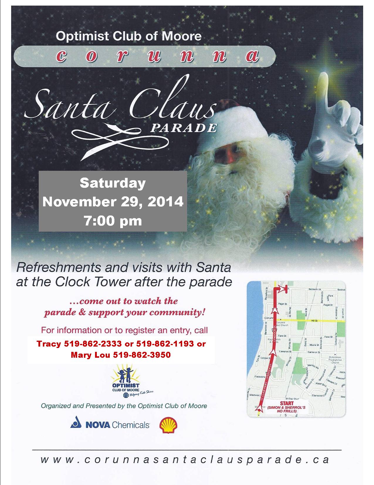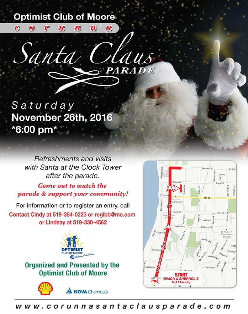The lighted parade will begin at Chris’ No Frills and travel north on Lyndock Street, ending at Beckwith Street in Corunna.